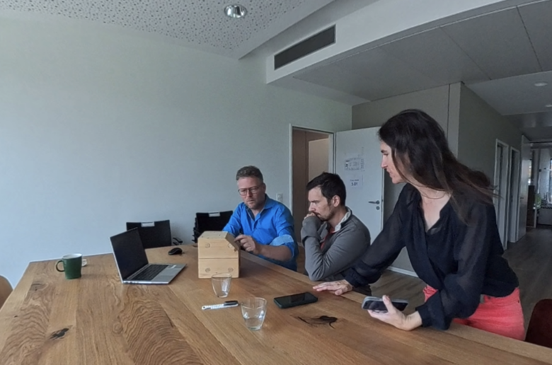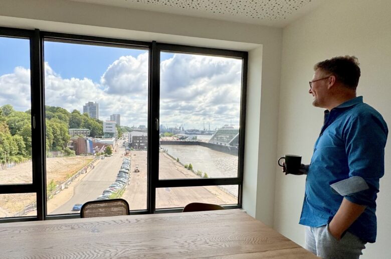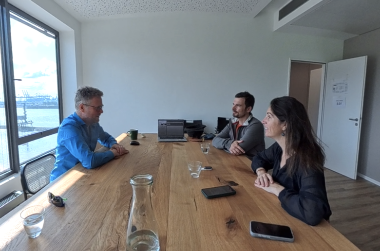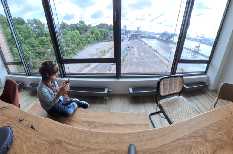 Nous sommes accueillis dans les nouveaux locaux de l’agence ; le déménagement est tout récent, des cartons pleins sont encore parsemés dans les locaux. Les employés prennent leurs marques, mais l’ambiance est conviviale, avec une grande salle commune pour le repas et les grandes réunions. Les bureaux sont plus éloignés du centre que les précédents mais la vue sur l’Elbe est très sympa.