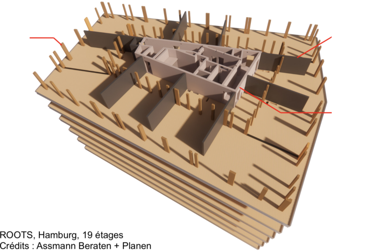 • Roots (Hambourg) : immeuble d’habitations de 19 étages avec noyau et socle de 4 étages en béton. Planchers CLT sur poutres acier et poteaux bois. Murs séparatifs non porteurs pour une grande flexibilité. Murs de façade à ossature bois préfabriquée en atelier. Fondations complexes à cause des contraintes portuaires. Un article